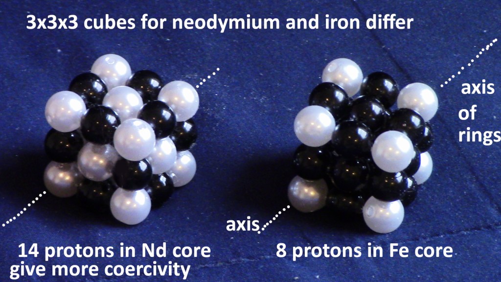 Now that the interiors of magnetic nuclei are known, the high coercivity of NdFeB magnets is explained. In neodymium, the cube in the core has 14 protons. Some of those constrain the changes in flux directions. That prevents the easy changes in north/south polarity that are observed for iron. A “pair” is an electron and its loyal proton.
