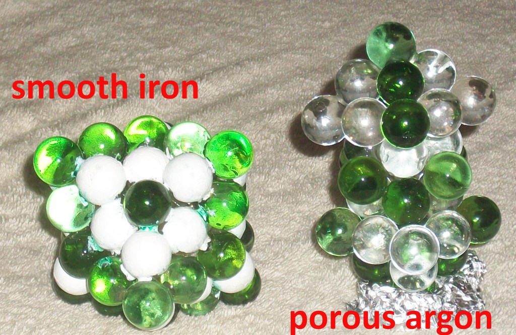 Iron has a 3 layer cube and argon has a 2-layer cube. That makes the argon porous. The small integers of light elements cause a coarse granularity of the discrete locations available for adding a nucleon into the lowest pit. (There are green protons and white neutrons in mock-ups).