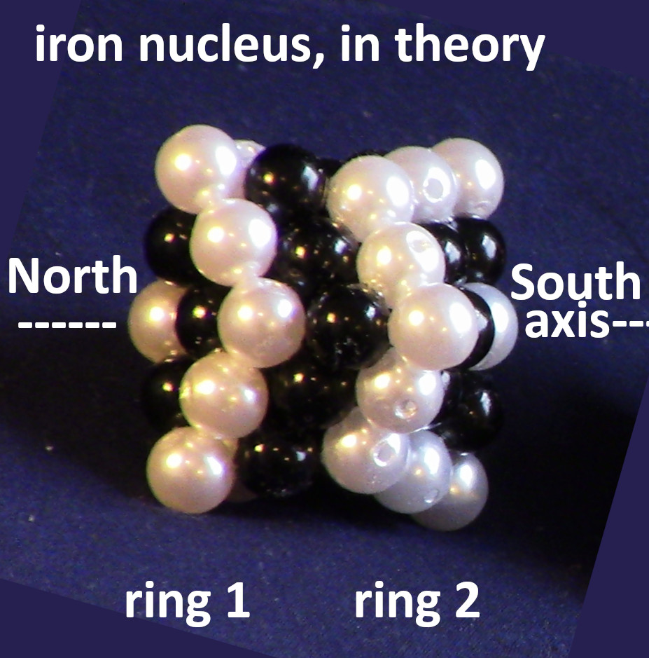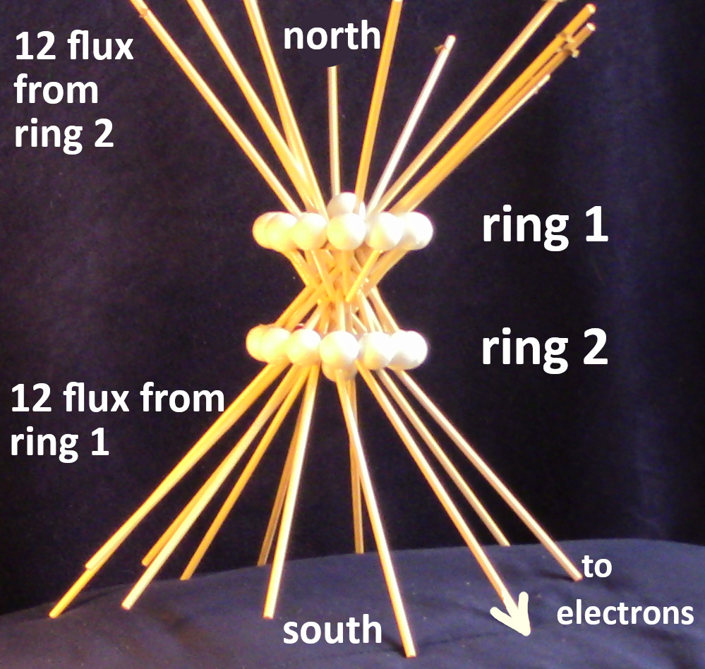 Figure 6: Simplified interior of iron nucleus, ring 1 makes south pole. The two white protons are the “axial protons” that ferromagnetic elements have. They limit the angles of the divergence of mechanistic magnetic lines of flux (yellow sticks). The axial proton has a spin that is compatible with the ring current direction. Nd does not have an axial proton on the surface of the nucleus, so it is nonferrous. The string is not used.