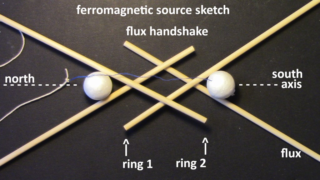 The Flux Handshaking Ferromagnetic Theory uses two pseudo-monopoles so one proton ring makes a South Magnetic Pole and the other proton ring makes a North Magnetic Pole! Monopoles are not possible. This is different from an electromagnetic coil of copper wires. An electromagnet makes a north pole and a south pole for any one loop of wire. Iron makes a north pole (Fig. 8) using ring 2 and a south pole from ring 1 only due to the flux vortexes touching each other and their spins being coordinated at the center of the nucleus. Those two vortexes touching inside the cube are determining a right-located electron eddy, or a left-located electron eddy, relative to proton rings. Opposite spins begin to bond, same spins slide. A copper solenoid electromagnet produces both eddies, far from each other, without a flux handshake to influence their positions.
