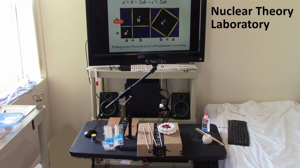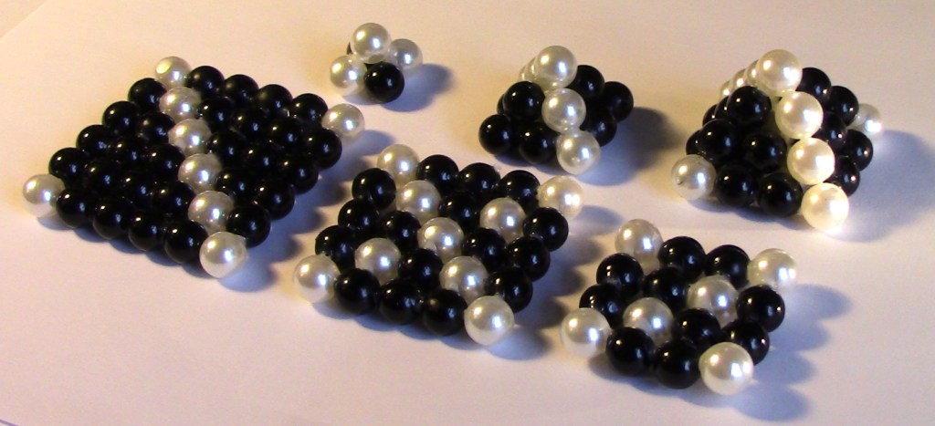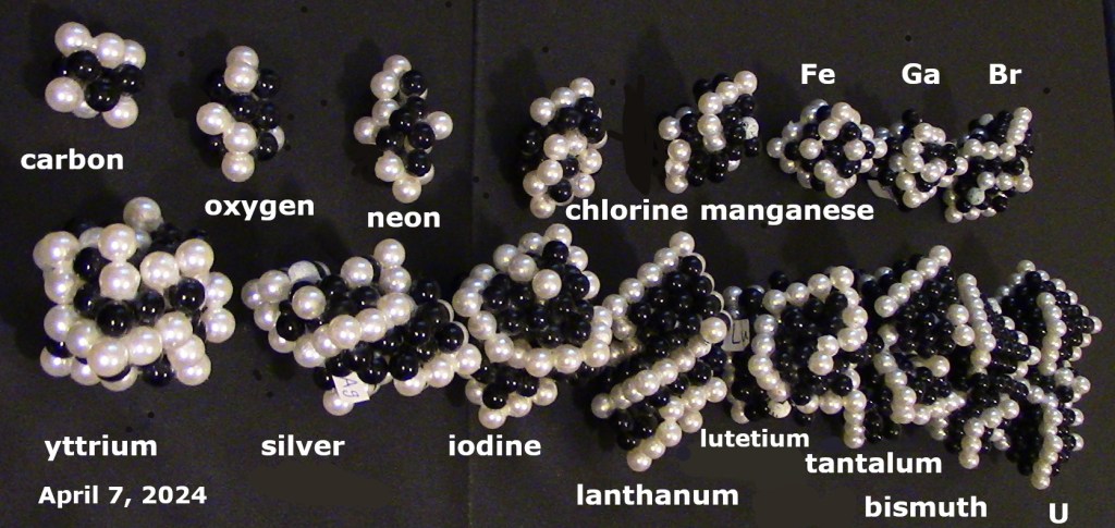 Welcome to a page to emphasize the progress I made in physical theory. Here is a photograph of models of nuclei at a scale of 2 trillion. White protons and black neutrons are used. Carbon is shown to have two planes of protons. The theory proposes that the shape of a nucleus drives the positions of electrons ( e– not shown). The converse is true: during fusion in a star, the electrons drive protons to make lines of protons. This involves electron-proton pairing, with temporary loyalty.