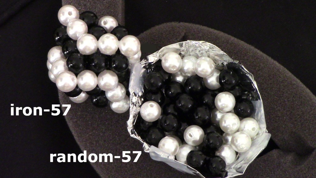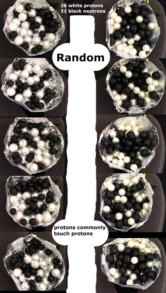 Experiments show protons make lines of protons in a randomized bead model. The images show random iron-57 candidates. On left are five images using 10mm white protons and 7mm black neutrons. On the right are five images with 8mm white protons and 9.5mm black neutrons.