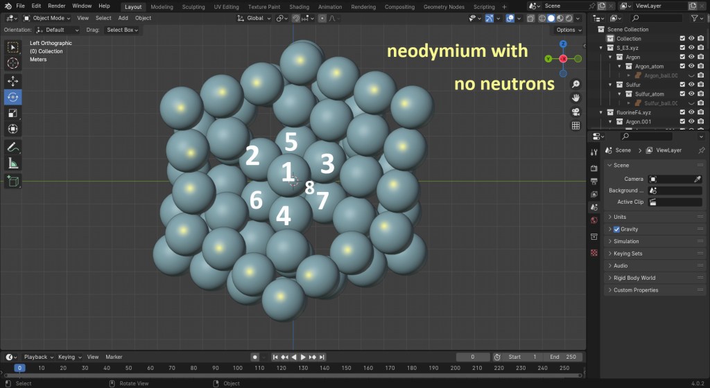 Figure 12: neodymium with labels on 8 protons in the center of the core, causing high coercivity. The cube has 14 protons but none are on the surface of the nucleus and none are in the rings. One ring is highlighted with 18 yellow dots.