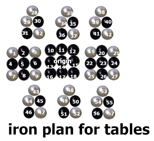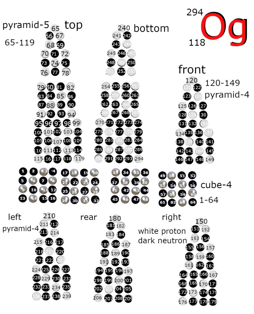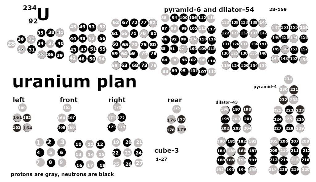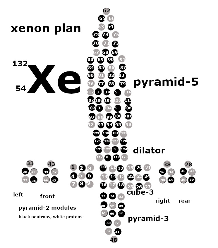 In the hardcover edition of the book, the figure for xenon was too small. This page has big versions of the Figures that were too small. Protons are white and neutrons are dark in these plans for nuclear structure. The full screen version comes up when you right click the image to get the menu.