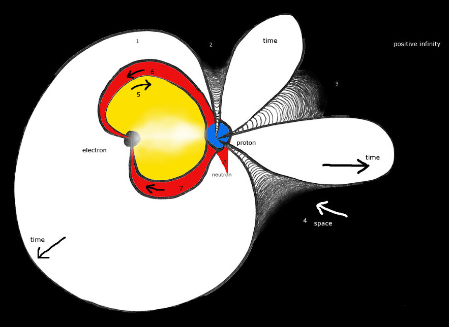 This is compatible with relativity. Time has the opposite direction as the gravitational motion of a space, relative to a massive piece of matter. Fig. 2 shows spacetime curvature, for time. The horizontal axis is R, the distance to the center of a carbon nucleus. The vertical axis the the time density W, which results in higher time derivatives being significant. The chain rule combines the variable time density with the varying speed of space near a nucleus. This can be a strong kind of gravity.