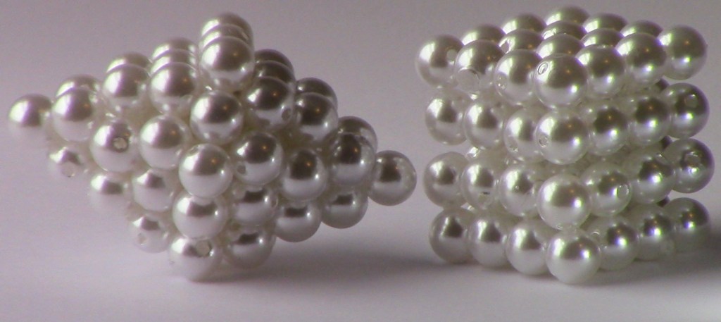 Figure 11: Hexagonal core candidate with 65 beads, cube with 64 beads as a candidate for nuclear core. Neutrons are gray, protons are gray.
