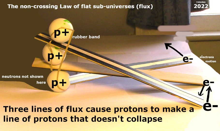 In Fig. 9 the rulers represent the wavefunction (flux) that connects a proton to an electron. The flat shape of the ruler helps emphasize that wavefunctions have two space-like dimensions and a time-like dimension going the other way. It is like a conveyor belt. Random motions of electrons make the rulers slide over each other and this keeps the orientation the same: the protons stack up with the rulers stacking up. The protons are attracted to each other by the strong nuclear force, represented by rubber bands. The three protons do not collapse together because the wavefunction is polarized. The net effect is that at a close range, Coulomb repulsion is not isotropic. Certain directions allow easy movement, so protons make lines of protons.